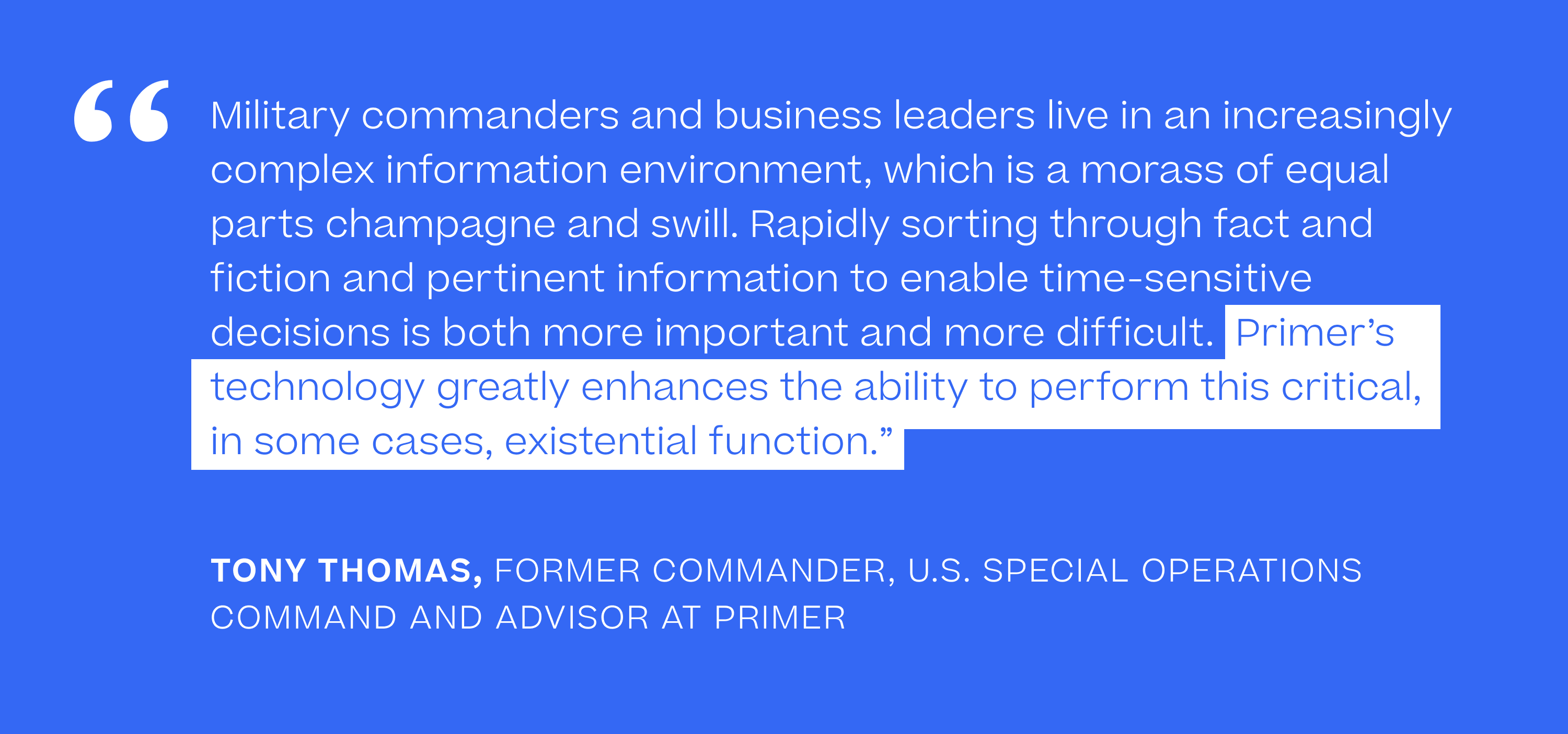 At Primer, we believe that analysts and operators deserve to have reliable and trusted AI now to achieve their mission and stay safe. Today it is abundantly clear that innovation is no longer just measured in hardware years, but in coding weeks. At a time of increasing geopolitical instability, the country that gets modern and reliable software capabilities into the hands of our analysts and operators first, wins. That’s why we are building secure, trusted, and interoperable AI that can be fielded in hours, not years.