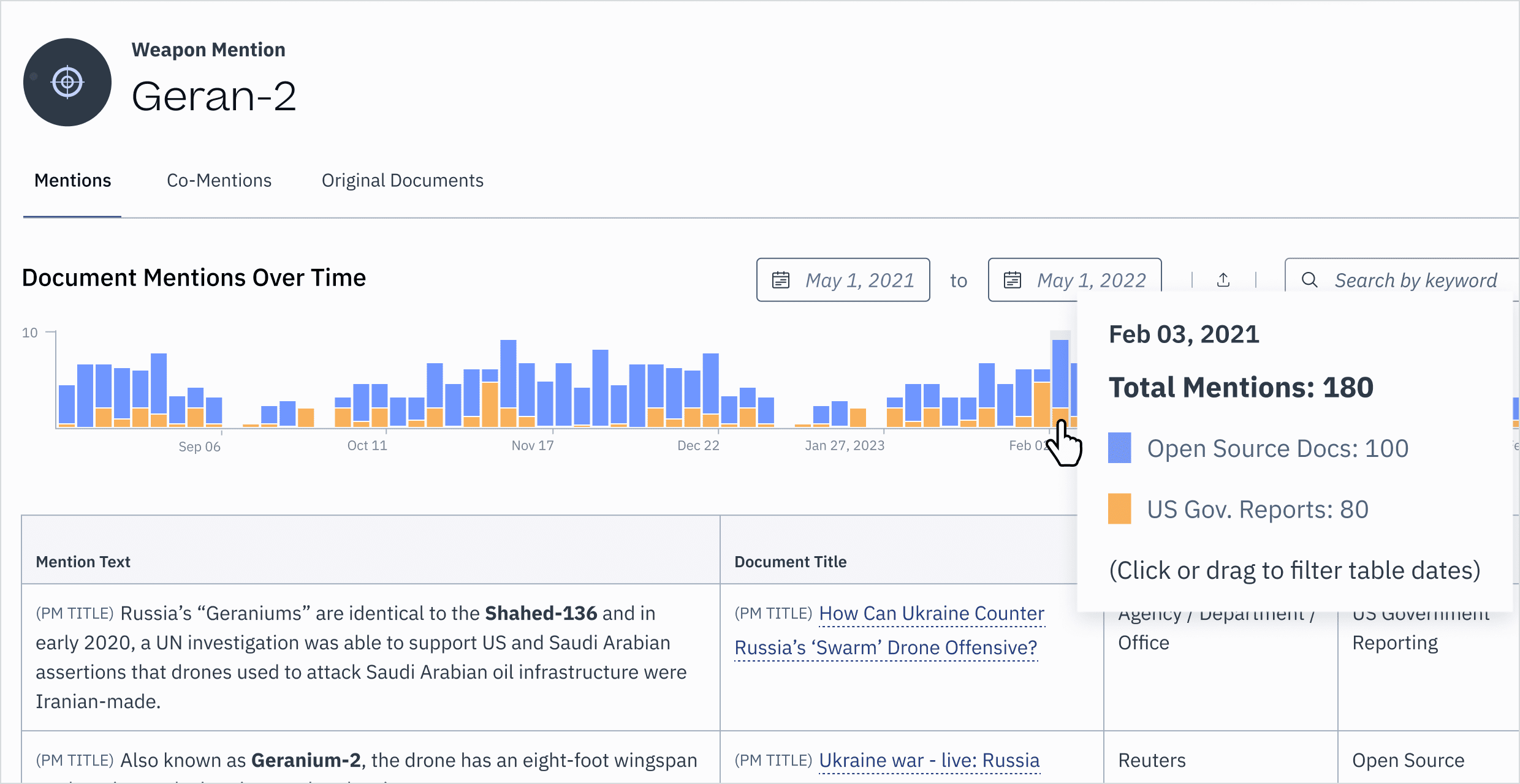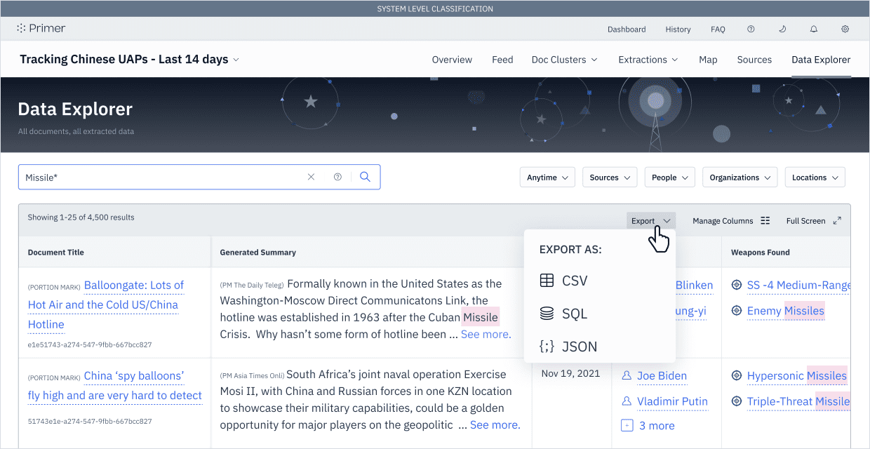 With Primer Delta, analysts and operators can intuitively surface, summarize, process and analyze messy multi-source data, including publicly available information (PAI) and proprietary data, with minimal effort and at unprecedented timelines. What used to take hours can now take minutes. Analysts save time by quickly identifying critical information, what’s new and what’s changed, and discover hard-to-find connections and trends. A self-generating and updating knowledge base and powerful views of mission-specific entities, locations, and events make for effective and efficient data exploration and alerting at scale.