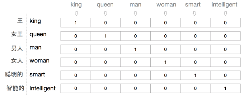 An easy way to represent words in vectors is to use one-hot encoding. This method uses a one-to-one mapping from each word in the vocabulary to an entry in a sparse vector matrix. A word is represented as all 0s with a 1 at the corresponding location. For example, let’s say you have a corpus with only six words: king, queen, man, woman, smart and intelligent. (Example borrowed from blog The amazing power of word vectors with slight modification.) The one-hot representations are: