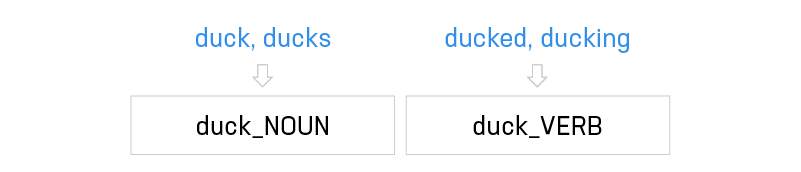 such as for example “duck”, “ducks”, “ducked” and “ducking”, gets replaced by a single lemma/part-of-speech combination, such as “duckNOUN” or “duckVERB”.